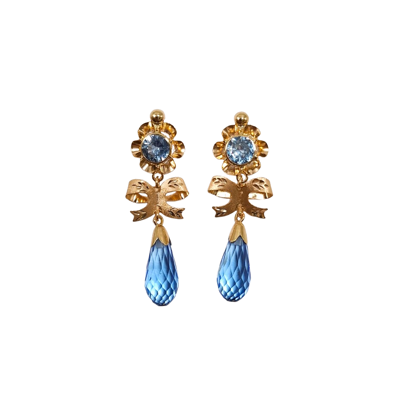 Pendientes de Oro de 18 Kilates Largos Con Lazo y Chupon Azul