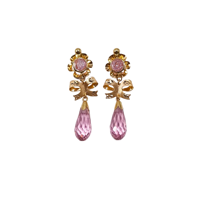 Pendientes de Oro de 18 Kilates Largos Con Lazo y Chupon Rosa
